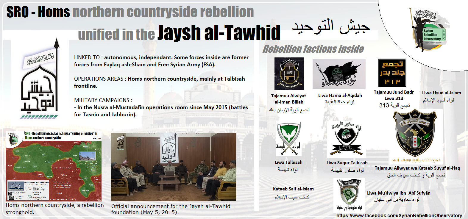 Talbisah liegt nördlich von Homs und hat oder hatte 30.000 Einwohner. Dort herrschen gerade die Rebellen. Tatsächlich nicht der Islamische Staat, sondern andere Verbände, nämlich nach dem Institute for the Study of War der „syrische Al-Kaida-Ableger Jabahat al-Nusra, der strikt islamistische Ahrar al-Sham und eine Anzahl anderer lokaler Rebellengruppen.“ Diese Teilen sich die Herrschaft. Unter anderem gibt es ein Shariagericht, aber auch kleine Demonstrationen gegen dasselbe Gericht: „Mehr als ein Dutzend Einwohner von Talbisa haben gegen ein örtliches Shariagericht protestiert, dass von Jabhat a-Nusra und Ahrar al-Sham kontrolliert wird, da dieses junge Männer einsperrt, ohne ihre Familien über ihr Verbleiben oder die gegen sie erhobenen Vorwürfe zu informieren.“ Und Adopt a Revolution hat da seit neuestem einen Projektpartner: ein Medienzentrum. Das ist Kronzeuge für die Harmlosigkeit der ansässigen Rebellengruppen: „Auch die Al-Kaida-nahe Jabhat al-Nusra, die auch Ziel der US-geführten Luftangriffe in Syrien ist, ist in der Gegend nicht aktiv.“ Ahrar al-Sham erwähnen sie lieber nicht und so behaupten sie: „Talbiseh wird von der Jaysh al-Tawhid kontrolliert.“ Soweit so schön. Jaysh al-Tawhid ist nach dem Internet ein im Mai 2015 gegründetes lokales Bündnis einiger Gruppen mit, gelinde gesagt, wenig vertrauenserweckenden Logos, die schon zeigen, dass es sich hier keineswegs nur um moderate Kräfte handelt, sondern auch um Bataillone der Islamischen Front. In Reaktion auf die neuerliche Offensive ihrer Feinde haben dann inzwischen nach Syria Direct die FSA, Al Nusra und Ahrar ash-Sham in den ländlichen Gebieten nördlich von Homs ein Militärbündnis gebildet und so kämpfen wie so oft alle Rebellenfraktionen des syrisch-islamischen Widerstandes Seite an Seite gegen das Regime Assads. Die Projektpartner haben die frohe Botschaft aber ihrem Partner Adopt a Revolution bislang nicht gefunkt und auch Thomas von der Osten-Sacken lässt sich durch solcherlei Umstände kaum beeindrucken.